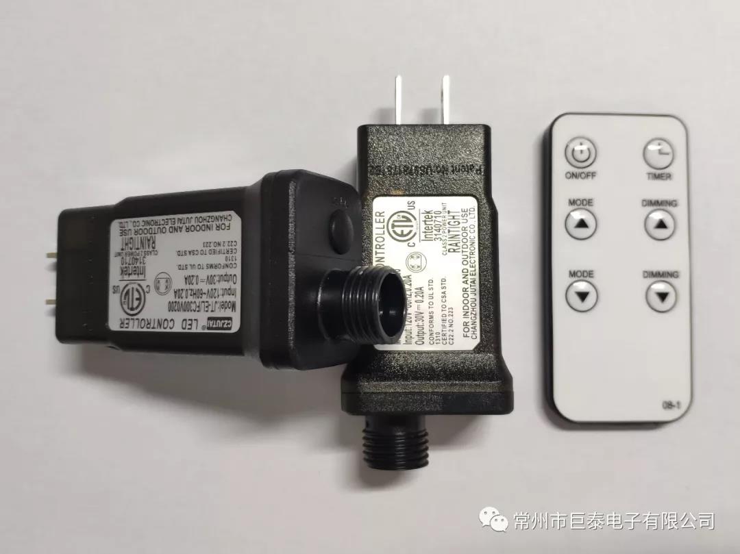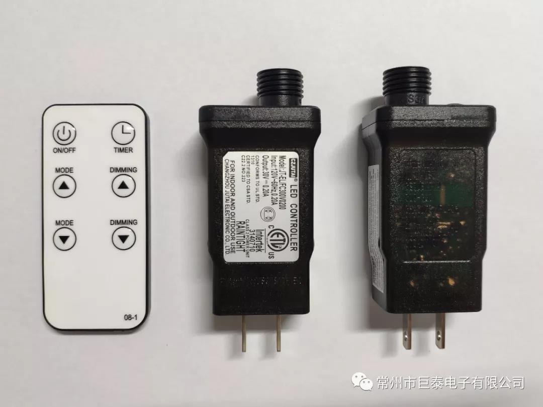 阅读次数:4899巨泰美规红外遥控一体式变压器,内置多功能控制(八功能、定时、调光、无极双色泡控制、RGB控制等功能),插上灯串直接可用,省去焊接独立控制器的工序,更加方便您的生产和出货。